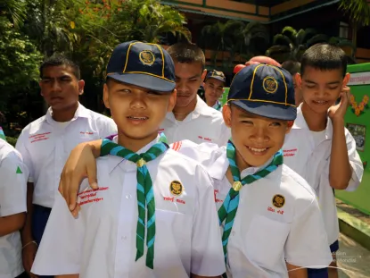 In every country he visits, His Majesty enjoys meeting with Scouts and often joining in activities. In Pattaya the Baden-Powell Fellows visited a school for the blind to see how Scouting is an important part of the students’ education. His Majesty gladly accepted the invitation to invest 20 new Scouts into the school’s troop.