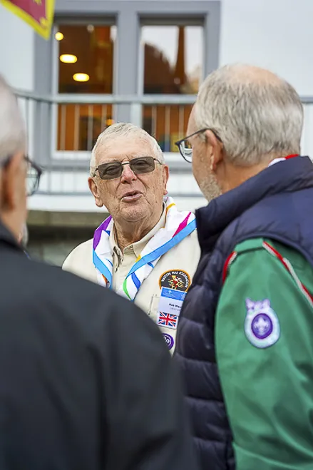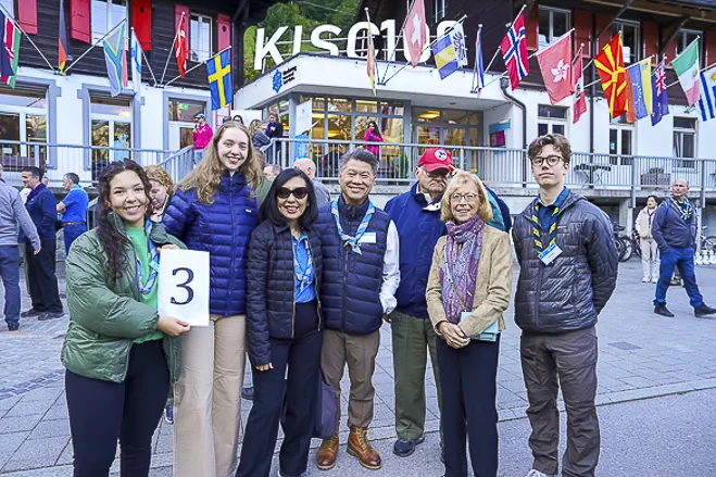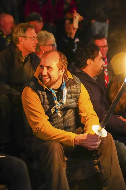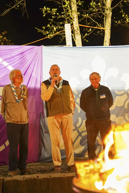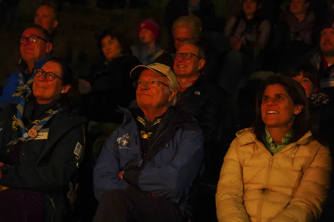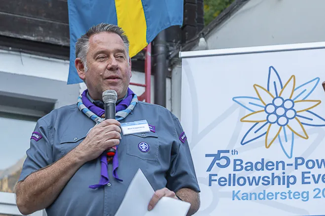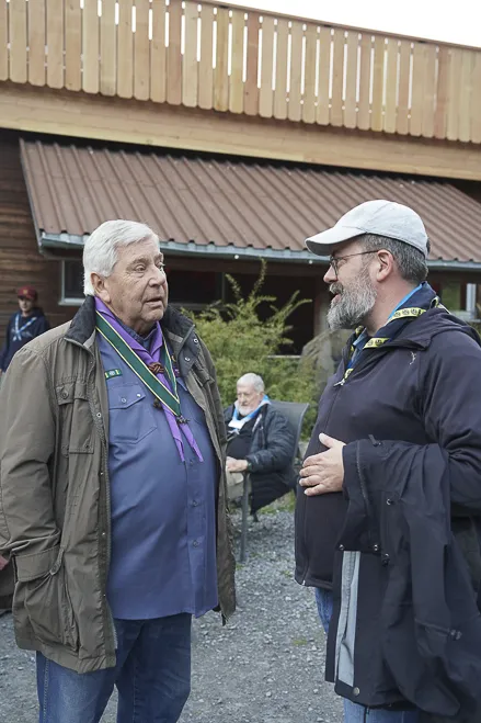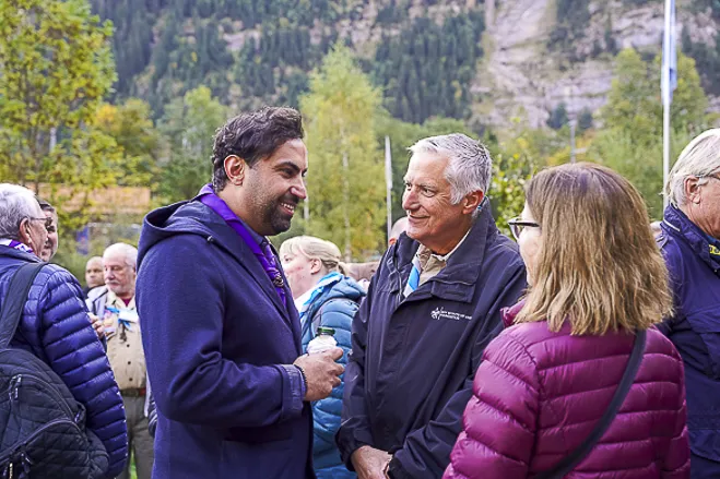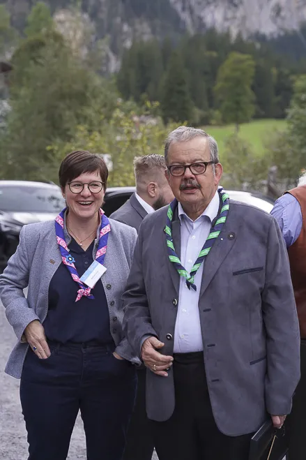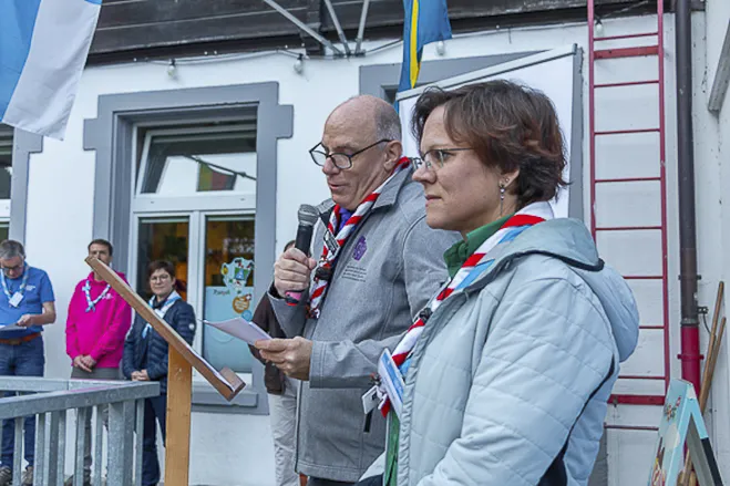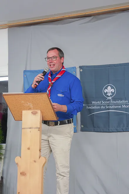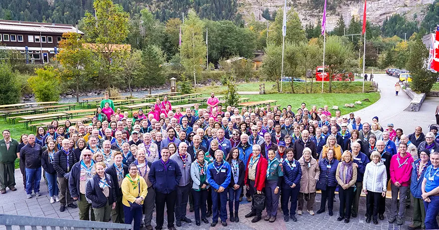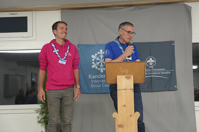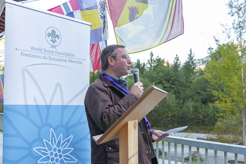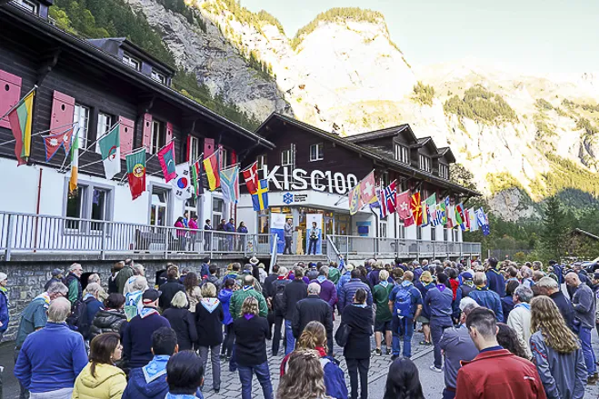 The 75th BP Fellowship Event was opened on Friday morning, 6 October, by HRH Prince Guillaume of Luxembourg, Chair* of the World Scout Foundation, Mark Knippenberg, Chief Executive Officer (CEO); Philippe Moser and Cristina Egli, Co-Presidents of the Swiss Guide and Scout Movement; Barbara Jost, Mayor of Kandersteg; Aidan Jones, Chair of the KISC Committee, and Jack Higgins, KISC Director; introduced by Nicole Gooderson, Deputy CEO of the World Scout Foundation. The Opening session ended with a flag break and group photo, then guests joined KISC-led Scout activities around the grounds and campsite