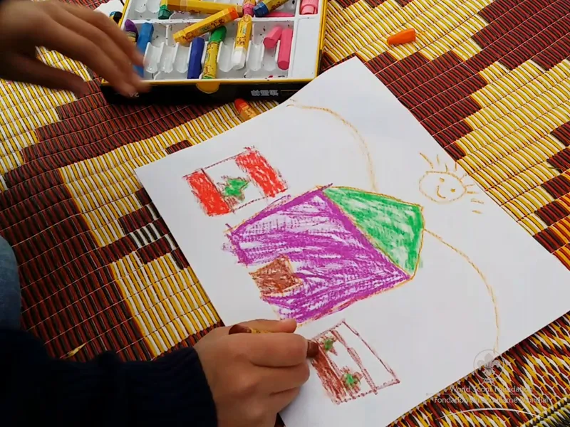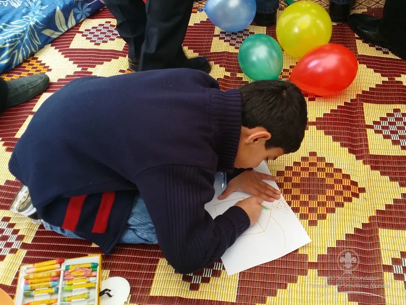 What young Thaaer saw, nobody knows, his eyes lack the light and hope of other kids his age, but thanks today to the Scouts of Lebanon, his family now has a home, his home (it’s a tent with beds and floor mats, warm blankets and warm clothes for his whole family – but to him, it’s a REAL home) and thanks to the smiling, caring volunteers from the Scouts, his feelings his dreams and his fears can be expressed not in words, but in colours on paper. And the masterpiece Thaaer has drawn for his mother is a picture of his new home, with a smiling sun looking down, and the flag from Lebanon there to protect him … a child’s view, but a wonderful one … “I feel safe” says the picture!