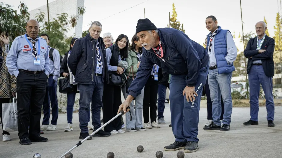We learned about community action in the next-door primary school, where Scouts were painting borders and walls, clearing rubbish and tending gardens, working side by side and exchanging stories as they went. Back at the Scout House and its surrounds, we joined in a thrilling game of pétanque with Scout elders. Some great shots were played, and each missed shot met with good-natured laughter and encouragement, exemplifying the great intergenerational spirit in Tunisian and all Scouting worldwide!