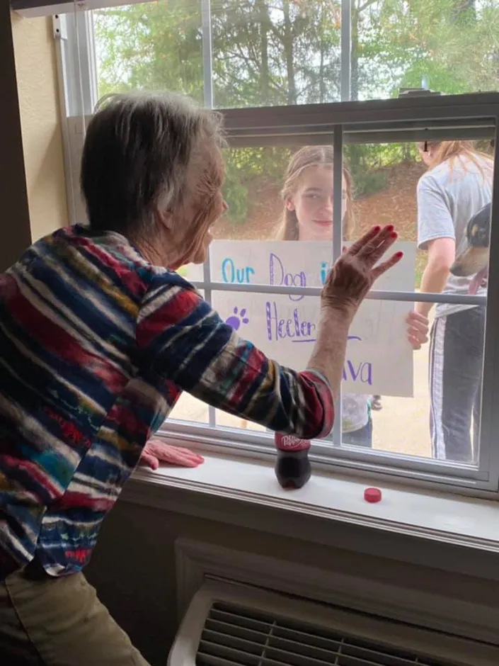 Shana, her husband (an Eagle Scout) and their four kids (all in BSA) also visit a local nursing home every Monday with their dog, interacting ‘through’ the closed windows with the residents who have been quarantined from the early days of the virus situation. They also play tic tac toe with them on their window using a dry erase marker, cheering up everyone involved, as you can see in the photos below! It's true, Scouting never stops!