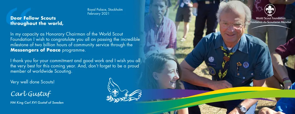 His Majesty King Carl XVI Gustaf of Sweden, Honorary Chairman of the World Scout Foundation, has congratulated Scouts worldwide on completing over 2 BILLION community service hours for the Sustainable Development Goals (SDGs) through the Messengers of Peace Initiative and as part of Scouts for SDGs.
